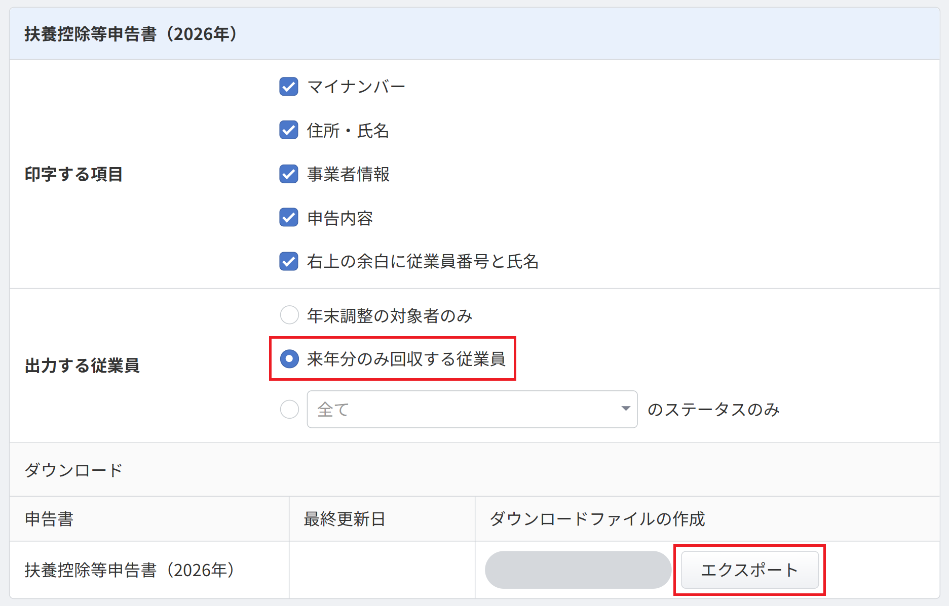 ※甲欄なのに年末調整の回答が無い方の年末調整のステータスを「来年分のみ回収」に設定した場合、「扶養控除等申告書(翌年)」の「来年分のみ回収する従業員」分も別途出力し、翌年からも甲欄で給与計算できるようにします。