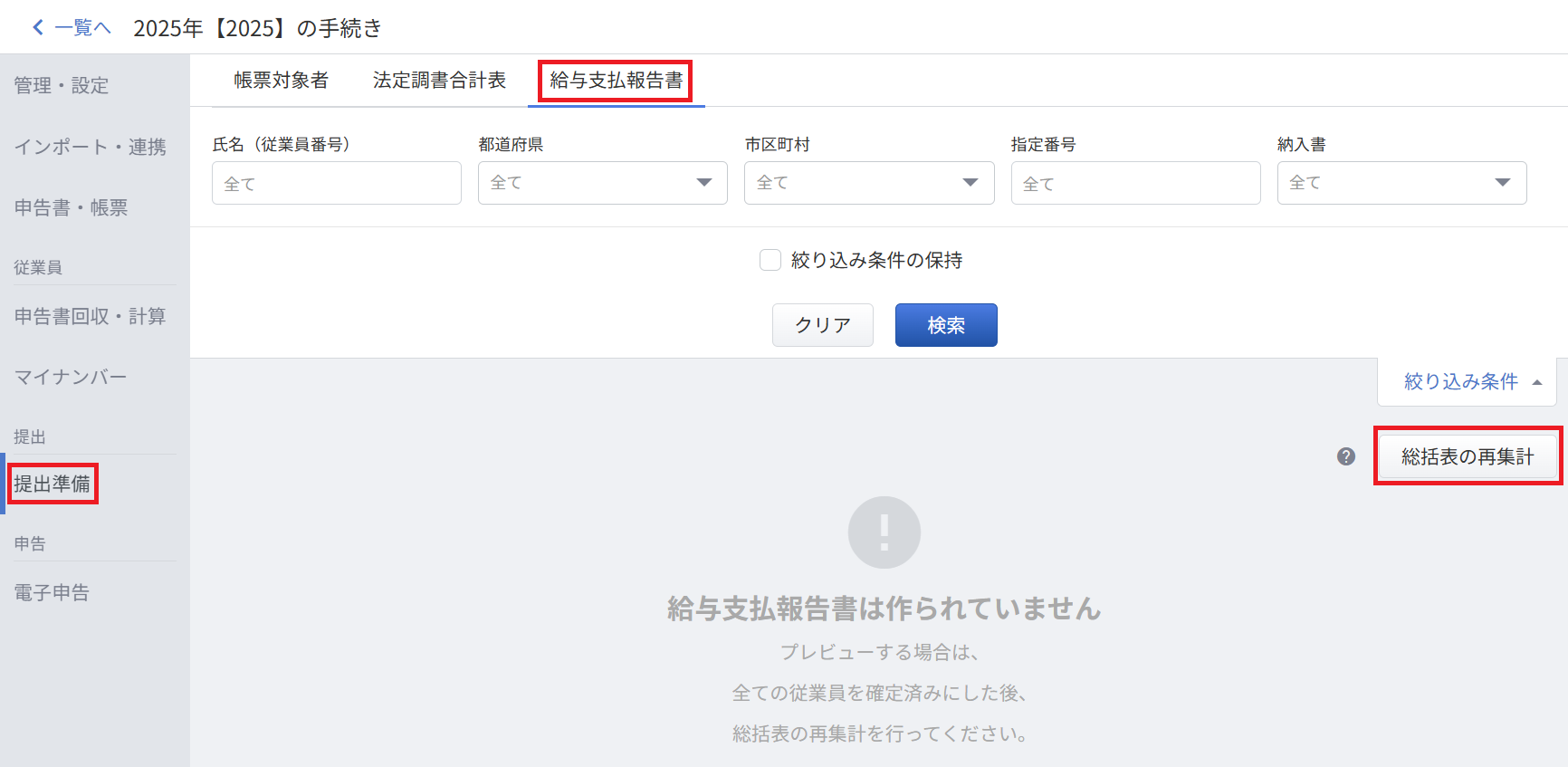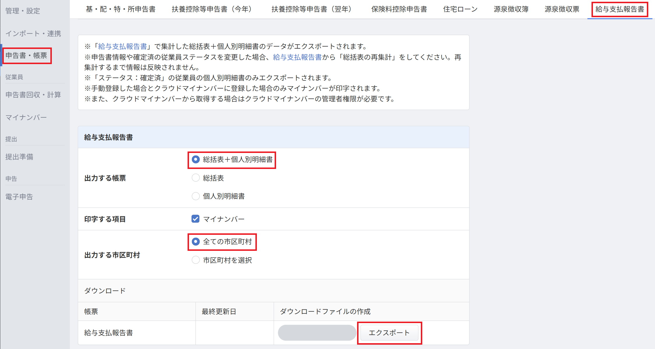 ※1 事前に「管理者画面>手続き>手続き名」の「提出準備」の「給与支払報告書」から「総括表の再集計」を行うと出力可能になります。